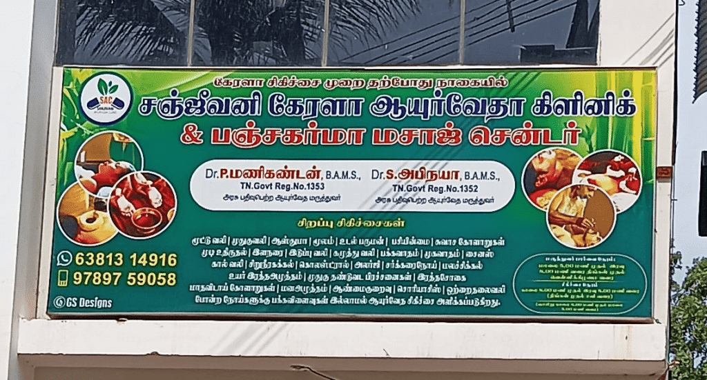 Sanjeevani Kerala Ayurvedha Clinic Doctors & Clinics ProfileSanjeevani Kerala Ayurvedha Clinic & Panchakarma Masaj Centre: Dr. P. Manikandan B.A.M.S TN Govt Reg No: 1353 Dr. S. Abinaya B.A.M.S TN Govt Reg No: 1352 சிறப்பு சிகிச்சை: Photos Map Loading... No Records Found Sorry, no records were found. Please adjust your search criteria and try again. Maps failed to load Sorry, unable to load the Maps API. Enter your locationGet Directions Travel modeDrivingWalkingBicyclingPublic Transport Distance unitsMilesKilometers Reviews Leave a Review Cancel reply Your email address will not be published.Review text Select a rating Name Email Website Save my name, email, and website in this browser for the next time I comment.